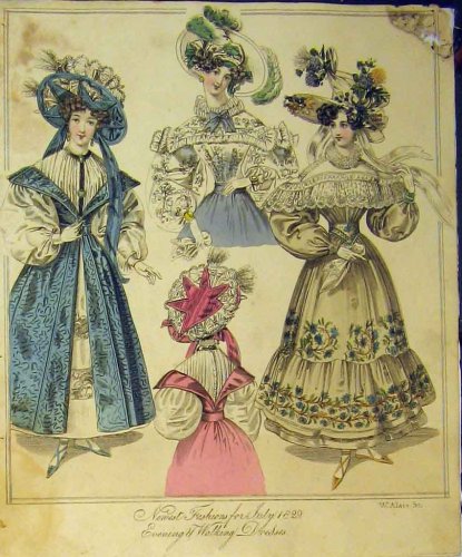 1829 WOMENS FASHION EVENING WALKING DRESSES HAT COLOUR Overview